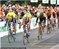 | Stage 8 - May 26: Phoenix Park Circuit Race, 50 km <Main Page> <Previous Stage> Win number 3 for Newton Holding a large lead going into the stage, Power needed just to avoid crashes and other misfortune in order to win the race. His Team Ireland Stena Line squad helped limit attacks in the criterium in Dublin's vast Phoenix Park, setting a high pace at the front of the bunch and reeling in anyone strong enough to have a go. Newton's Great Britain squad took over the pace-setting in the closing stages, lining out the bunch and paving the way for another powerful sprint by the points classification leader. Power was in the perfect position as the gallop began, but gear problems initially hampered his charge. He accelerated noticeably in the closing metres but just failed to pass Newton before the line. "It was very close", Power said afterwards. "I had trouble getting the bike into the eleven sprocket for the sprint and had to sprint in the saddle until the chain dropped down, with about 30 metres to go. I nearly passed Newton but the line came just a bit too soon. But winning the race overall is the most important thing." 1 Chris Newton (GBr) Great Britain 1.12.45 |